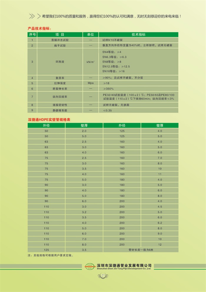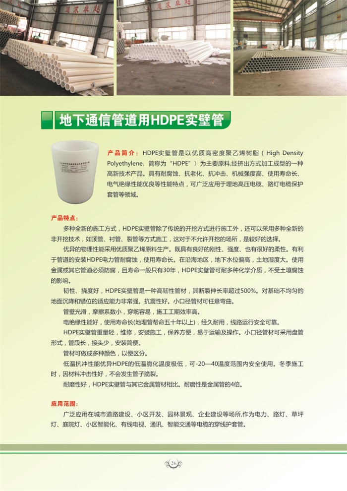 HDPE實壁管是以優(yōu)質(zhì)高密度聚乙烯樹脂( High Density Polyethylene,簡稱為"HDPE")為主要原料,經(jīng)擠出方式加工成型的一種高新技術(shù)產(chǎn)品。具有耐腐蝕、抗老化、抗沖擊、機械強度高、使用壽命長、電氣絕緣性能優(yōu)良等性能特點,可廣泛應(yīng)用于埋地高壓電纜、路燈電纜保護套管等領(lǐng)域