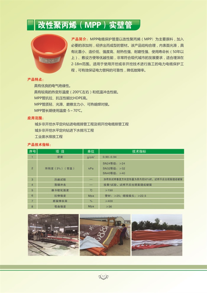 MPP電統(tǒng)保護(hù)管是以改性聚丙烯(MPP)為主要原料,加入必要的添加劑,經(jīng)擠出而成型的管材。該產(chǎn)品結(jié)構(gòu)合理,內(nèi)表面光滑,具有比重小、造價低、強(qiáng)度高、耐熱性強(qiáng)、耐磨性強(qiáng)、使用壽命長(50年以上)、敷設(shè)方便等優(yōu)越性能,非常符合現(xiàn)代城市的發(fā)展要求,適合埋深在2-18m范圍。適用于使用開挖或非開挖技術(shù)進(jìn)行施工的電力電纜保護(hù)工程,可有效保證電力管網(wǎng)的可靠性,降低故障率