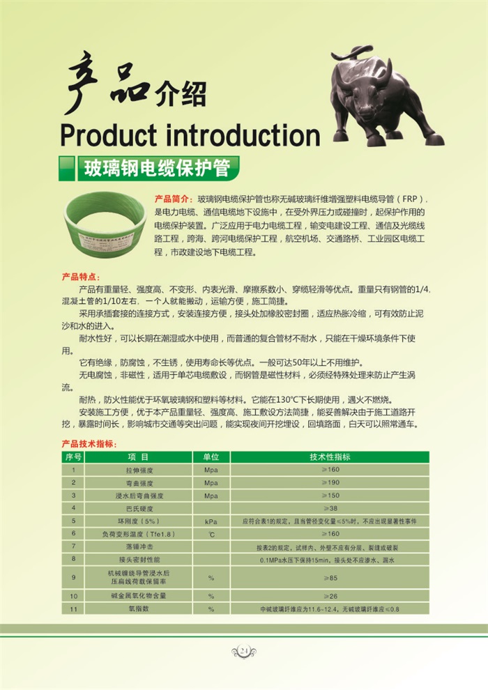 玻璃鋼電纜保護管也稱無堿纖維強強塑料電導(dǎo)管(FRP),是電力電纜、通信電纜地下設(shè)施中,在受外界壓力或碰撞時,起保護作用的電纜保護裝置。廣泛應(yīng)用于電力電纜工程,輸變電建設(shè)工程、通信及光纜線路工程,跨海、跨河電纜保護工程,航空機場、交通路橋、工業(yè)園區(qū)電纜工程,市政建設(shè)地下電纜工程。