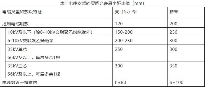 2電纜支架的層間允許最小距離,當設計無規(guī)定時,可采用表1的規(guī)定。但層間凈距不應小于2倍電纜外徑加10mm,35kV及以上高壓電纜不應小于2倍電纜外徑加50mm。