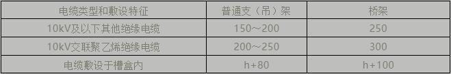 (4)支架層間允許最小距離,當(dāng)設(shè)計無要求時,可采用下表的規(guī)定。但層間凈距不應(yīng)小于電纜外徑的2倍加10mm。
