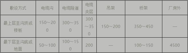 (5)電纜支架最上層及最下層至溝頂、樓頂或溝底、地面的距離,當(dāng)無設(shè)計要求時按下表要求。