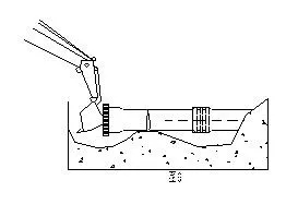 2.7對直徑小于1500mm的管道,可通過能跨地溝的挖掘機來插接。即在承口前面放置一塊或若干塊相當?shù)哪举|墊板保護管道端面,以防被挖掘機吊頭碰傷。然后旋轉吊頭使其緊貼墊板并推動管道使承插口連接。(見圖9)